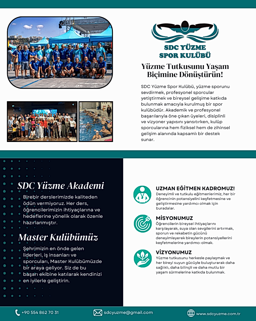 25 Yaş üstü master yüzme spor kulübümüz haftaiçi 2 gün havuz ve 1 gün kara antrenmanı yapmaktadır. Kısa kulvar ve uzun kulvar havuz yarışlarının yanısıra İstanbul ve Çanakkale Boğazı dahil tüm açıksu yarışlarına katılmaktadır. Bu benzersiz deneyimlere ulaşmak için bize ulaşabilirsiniz.